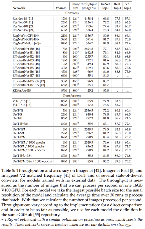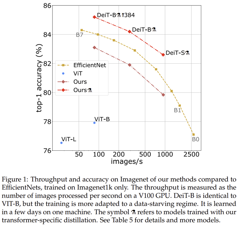 그림 1은 EfficientNet, ViT, DeiT 모델 사이의 성능을 비교하고 있습니다. 실제로 기존의 CNN 모델이나 ViT에 비해 훨씬 높은 성능을 보이고 있습니다. 여기서 중요한 점은 오직 ImageNet-1K에만 학습했음에도 Transformer가 성능이 높다는 점 입니다.