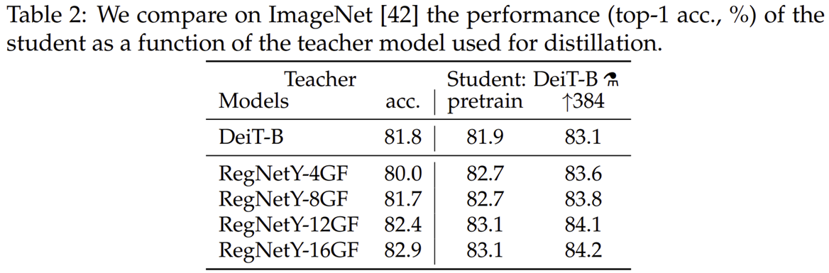 표2는 Teacher Model을 선택하기 위해 RegNetY 모델의 변형 구조들을 ImageNet-1K에 학습했을 때 성능을 보여주고 있습니다. 결과적으로 RegNetY-16GF가 가장 좋은 성능을 내어 해당 모델을 Teacher Model로 채택하였습니다.