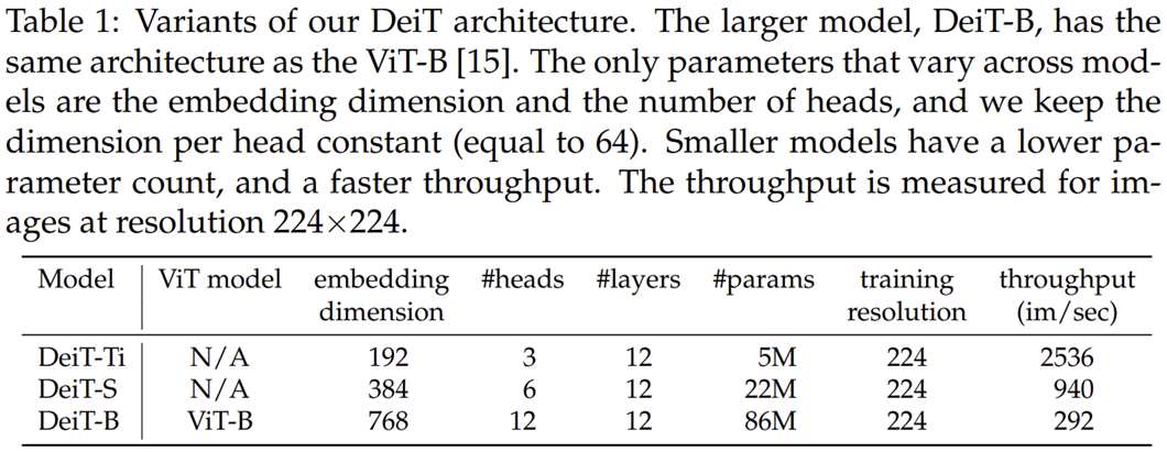 본 논문에서는 총 3개의 파라미터 개수에 따른 DeiT 모델의 변형 구조들을 제시합니다. 이는 표1에 나와있죠.