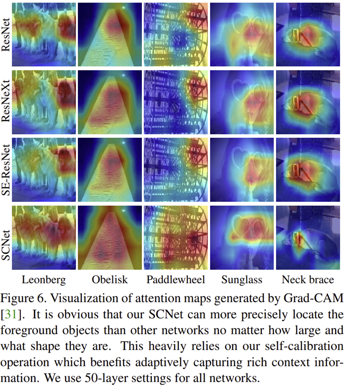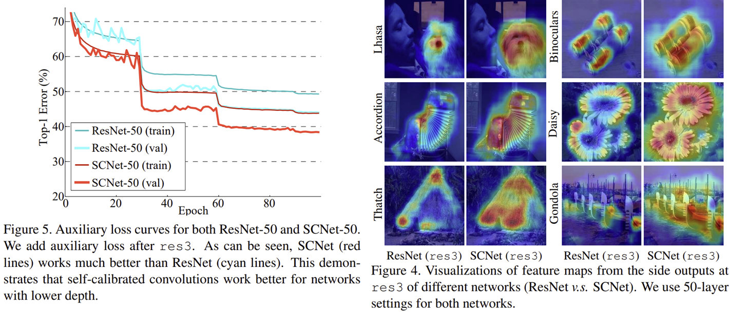 마지막으로 original path와 self-calibration path의 출력 특징 맵을 하나로 concatenation하여 다음 계층으로 보내줍니다. 위와 같이 진행했을 때 처음에 본 논문에서 목표로 하던 것과 같이 추가적이 파라미터를 사용하지 않고도 Attention이 달성될 수 있다는 것에 큰 의의가 있습니다.