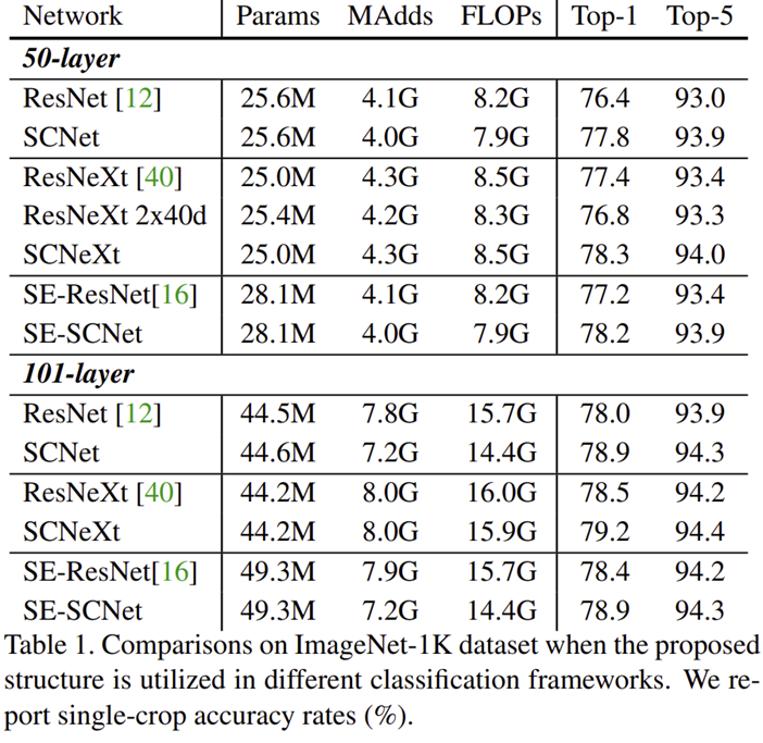 표1은 ResNet 계열의 모델에 SC Convolution을 추가했을 때 ImageNet-1K에서의 성능을 보여주고 있습니다. 파라미터는 SC Convolution을 적용하기 전 후 동일한 것을 볼 수 있죠. 심지어 연산량은 오히려 감소한 것을 볼 수 있습니다. 이는 필터의 개수는 동일하지만 중간에 채널 크기의 감소 + 해상도의 감소로 인한 것으로 볼 수 있습니다. 또한, 분류 성능 역시 모든 부분에서 크게 향상된 것을 볼 수 있습니다.
