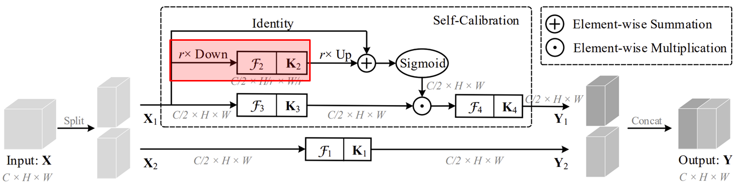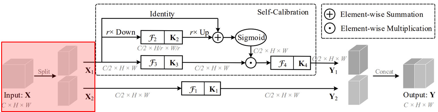 다음으로 입력 특징 맵 $\mathbf{X}$를 두 개의 특징맵으로 나누어 서로 다른 path에 입력해줍니다. $\mathbf{X} = \{ \mathbf{X}_{1}, \mathbf{X}_{2} \}$라고 하면 $\mathbf{X}_{1}$은 Self-Calibration path 그리고 $\mathbf{X}_{2}$은 Original path로 넘겨줍니다. 이때, 각 path로 넘겨지는 특징 맵의 채널의 개수는 $\frac{C}{2}$가 됩니다.