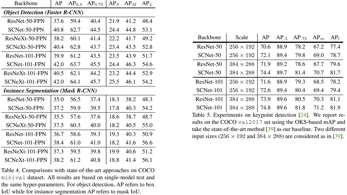 표4와 표5는 객체 탐지, 인스턴스 분할, 사람 키포인트 탐지와 같은 어플리케이션에서 SC Convolution을 적용했을 때 성능 향상 정도를 보여주고 있습니다.