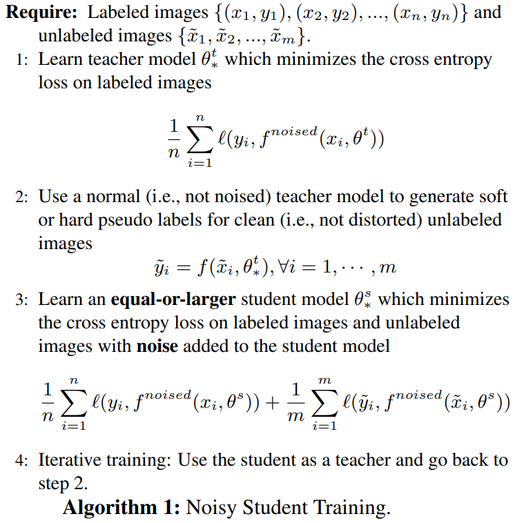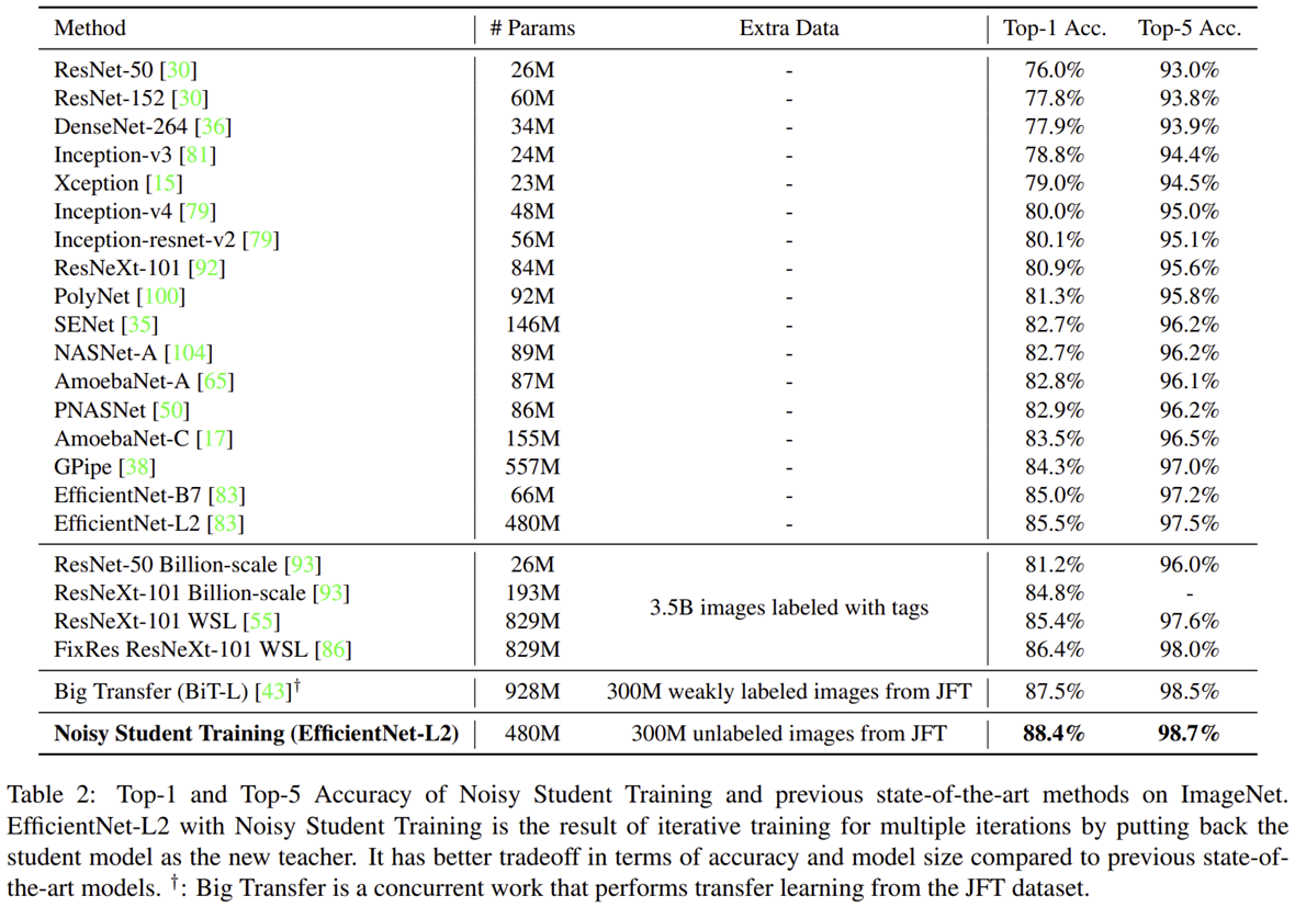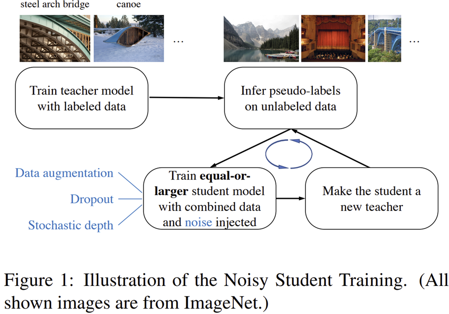 그림1은 Noisty Student Training의 전체적인 과정을 보여주고 있습니다. 보시면 일단, Teacher 모델을 labeled dataset으로 학습하게 됩니다. 여기서 labeled dataset은 ImageNet이 되겠죠? 다음으로 학습이 종료된 Teacher 모델을 이용해서 unlabeled dataset에 대한 psuedo-label을 만들어내게 됩니다. 여기서, unlabeled dataset에는 ImageNet에 존재하지 않는 label도 존재합니다. 현재 저희는 unlabeled dataset에 대해서도 pseudo-label을 만들었기 때문에 이제 Student 모델을 이용해서 supervision 학습이 가능합니다. 이때, Student 모델은 이전에도 설명드렸다 싶이 Teacher 모델보다 동일하거나 더 큰 규모의 모델로 구성합니다. Student 모델을 학습할 때는 노이즈들 (데이터 노이즈 및 모델 노이즈)를 주입하면서 학습을 진행합니다. Student 모델도 학습이 종료되면 학습된 Student 모델을 다시 Teacher 모델로 정의하고 unlabeled dataset의 pseudo-label을 다시 만들어 새로운 Student 모델을 만들어 학습을 진행합니다. 본 논문에서는 이러한 과정을 Iterative Learning으로 이야기하고 있습니다.