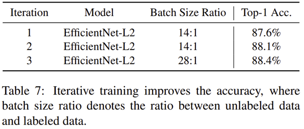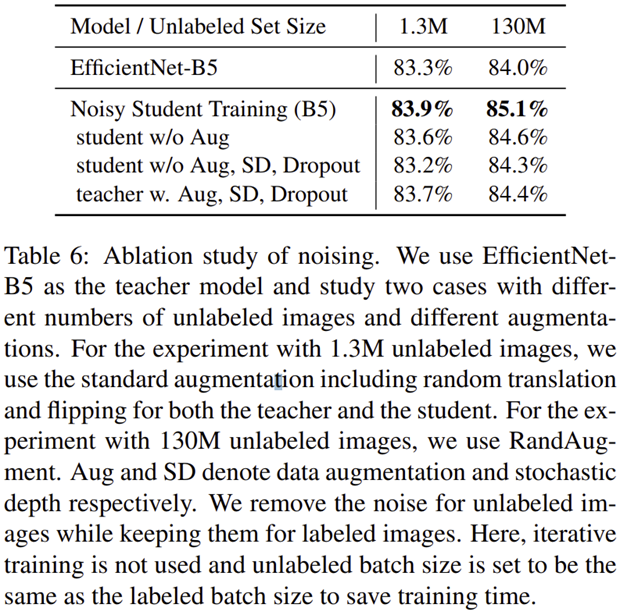 표 6에서는 Noisy Student Training의 노이즈의 중요성을 보여주고 있습니다. 모든 노이즈를 적용했을 때 가장 높은 성능을 얻게 됩니다. 다만, Teacher 모델에 노이즈를 적용하면 성능이 약간 하락하는 데 이는 pseudo-label을 구성할 때 오히려 방해가 되서 그러지 않나 생각이 듭니다.
