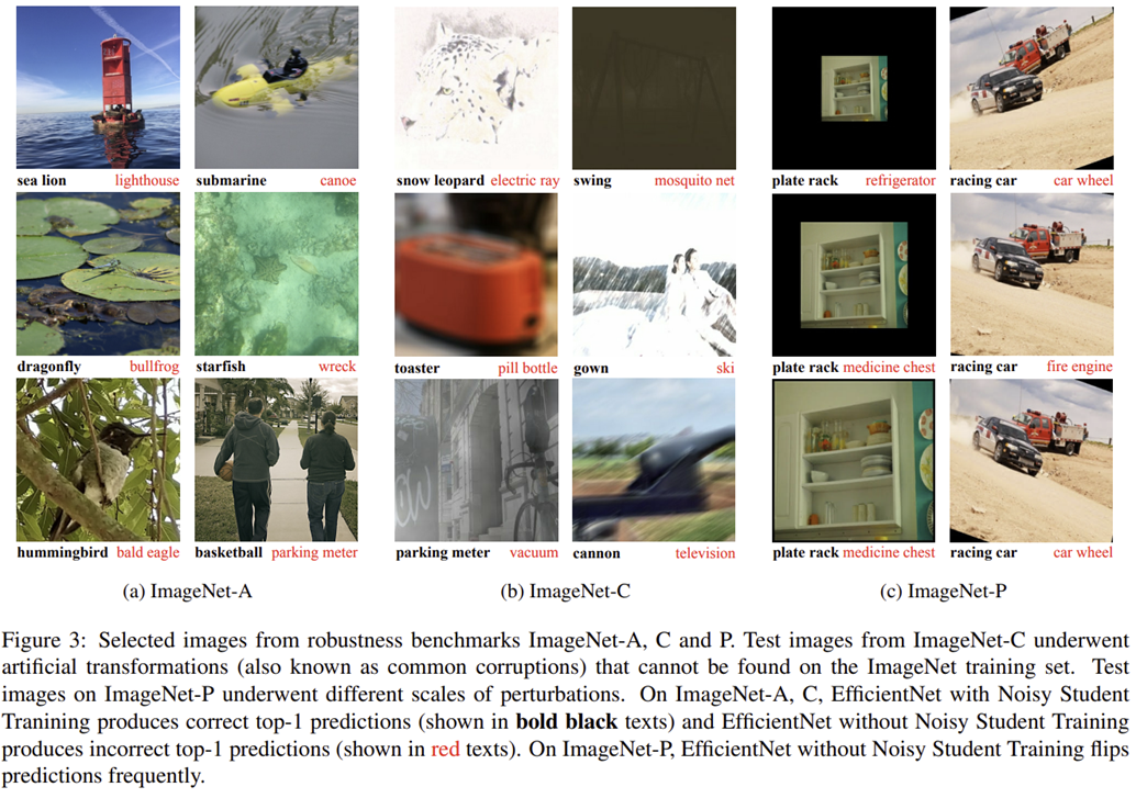 그림 3은 ImageNet-A, ImageNet-C, ImageNet-P에서 Noisy Student Training (검은색)과 EfficientNet (빨간색)의 예측 결과를 보여주고 있습니다. 본 논문에서 제시하는 모든 영상에서 강건하게 예측하고 있음을 볼 수 있습니다.