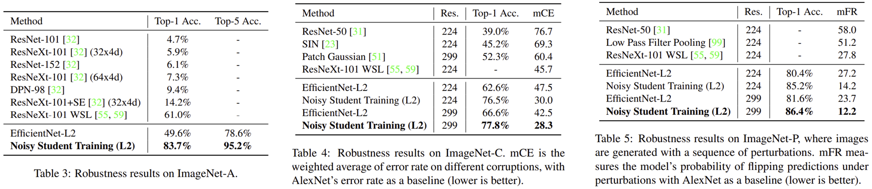 다음으로 Robustness 테스트까지 수행합니다. ImageNet-A은 기존의 ImageNet보다 더욱 어려운 영상들로 구성되어 단순한 모델들에서는 성능이 매우 낮지만 Noisy Student Training에서는 유일하게 80%이상의 성능을 보여주고 있습니다. 뿐만 아니라, 15개의 오염 데이터셋으로 구성된 ImageNet-C와 변동 데이터셋으로 구성된 ImageNet-P에서도 모두 높은 성능 향상을 보여주고 있습니다.