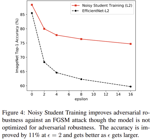 그림2는 Noisy Student Training이 Vanilla EfficientNet에 비해서 얼마나 성능이 향상되었는 지 볼 수 있습니다. 파라미터가 증가할 수록 성능 향상 차이가 점점 커지게 됩니다 (0.8% ~ 1.4%).