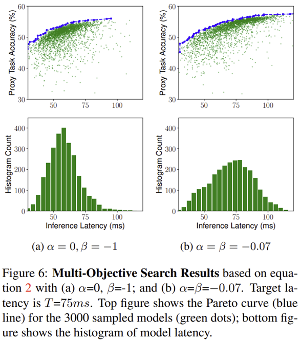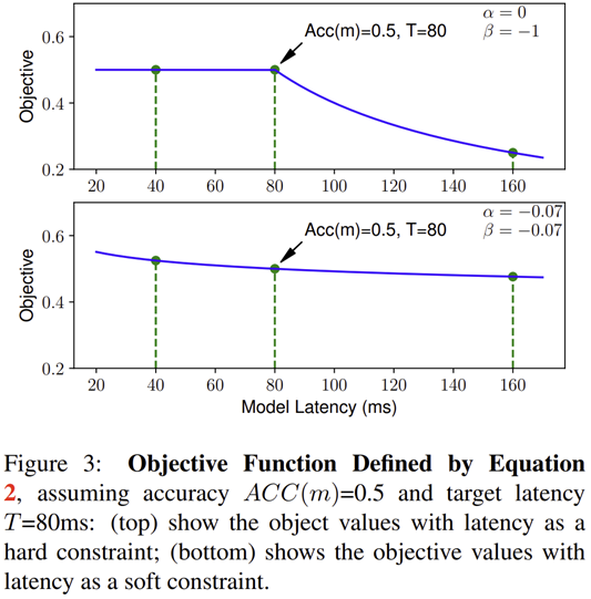 그림 3은 $\alpha$와 $\beta$ 값에 따른 Objective의 감소를 볼수 있습니다. $\alpha = 0, \beta = -1$를 먼저 보겠습니다. 이 말은 $LAT(m) \le T$이면 (샘플링된 모델 $m$의 inference latency가 target inference latency보다 낮은 경우) $\alpha = 0$이고 이는 $w = 0$임을 의미하기 때문에 objective function에서 inference latency $LAT (m)$은 고려되지 않습니다. 이는 기존의 본 논문에서 목표로 하고자 하는 Multi-Objective Search가 수행되지 않을뿐더러 그림 3의 위에 있는 그림과 같이 중간에 non-smoothing point가 생겨 최적화를 어렵게 만들게 됩니다. 따라서, 이러한 문제를 해결할 수 있는 것이 위 방정식을 풀어서 얻은 $\alpha = \beta = -0.07$이 되는 것이죠. 실제로 그림 3의 아래에 있는 그림과 같이 objective function의 수렴은 느리지만 상대적으로 훨씬 부드러워 최적화가 잘 될 수 있을 것 입니다.