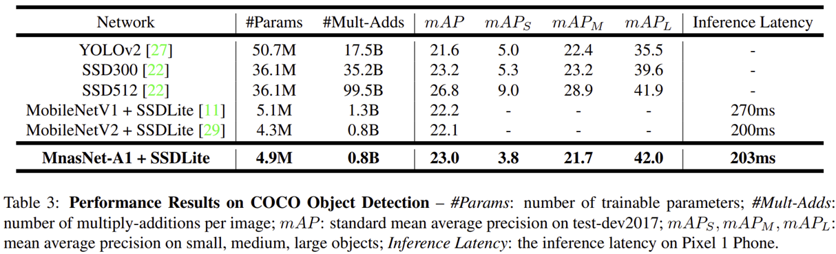 - COCO에서 SSD300 모델의 backbone 모델로 MNASNet에서 찾은 모델을 사용했을 때 inference latency와 mAP 모두에서 MobileNetV2 보다 뛰어난 성능 달성