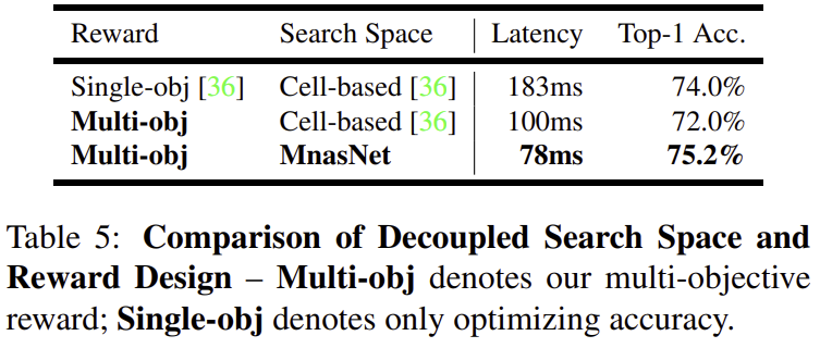 표 5는 Single Objective vs Multi Objective 그리고 Cell based search space vs Block based search space의 성능을 비교하고 있습니다. 일단, Multi-Objective 기반 최적화 결과가 inference latency도 동시에 고려할 수 있기 때문에 최종적으로 얻는 inference latency를 Single-Objective에 비해 많이 감소하는 것을 볼 수 있습니다. 하지만, Top-1 성능도 약 2% 정도로 떨어진 것을 볼 수 있죠. 이는 Cell-based로 수행하게 되면 상대적으로 샘플링되는 모델의 다양성을 보장할 수 없기 때문에 발생하는 문제로 볼 수 있습니다. 이때, MNASNet에서 제안하는 블록 기반 Searching Space로 변경하게 되면 보다 다양한 모델들을 샘플링함으로써 sub-optimal에 빠질 확률을 감소시킬 수 있기 때문에 성능이 향상됩니다.