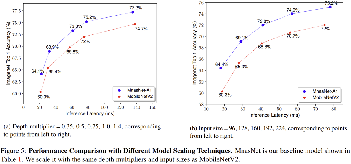 - 그림 5는 MNASNet의 Model Scaling 시얻는 성능을 MobileNetV2와 비교하고 있습니다. (a)는 깊이 (Depth)에 대한 Scaling을 수행했을 때 (b)는 입력 영상의 해상도 (input resolution)에 대한 Scaling을 수행했을 때 입니다.