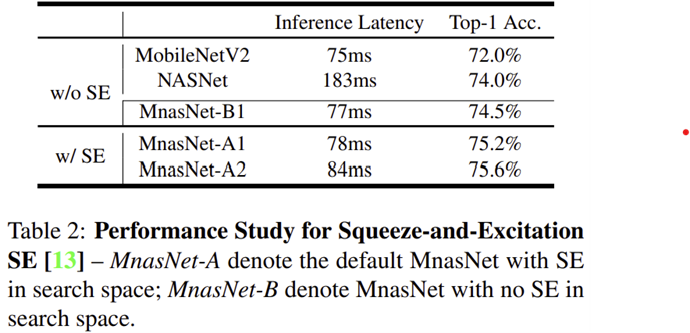 - 표 2는 당시 (2019년)에 각광받던 Squeeze-and-Excitation Block을 Search Space에 추가했을 때 성능을 보여주고 있습니다.