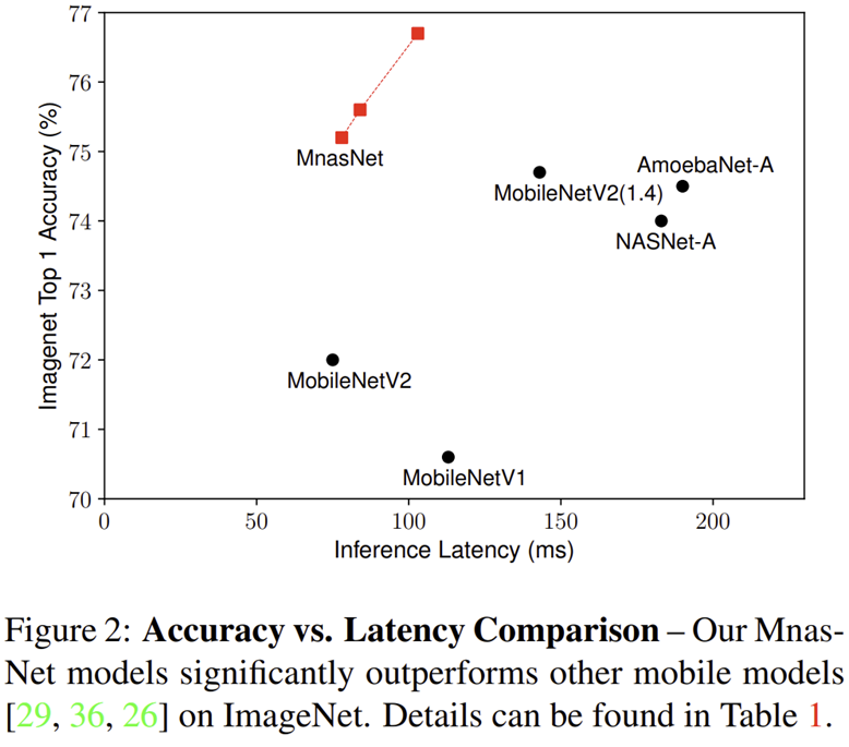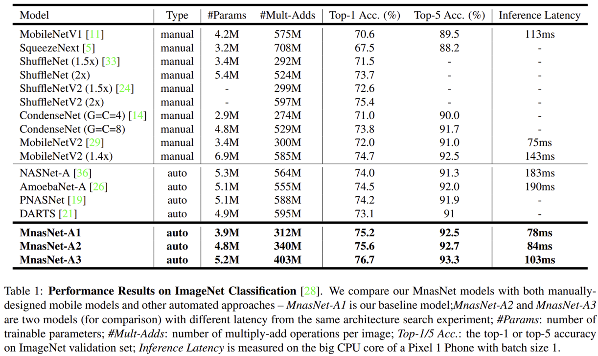 - 그림 2은 MNASNet, MobileNetV1, MobileNetV2, NASNet, AmoebaNet과의 inference latency vs ImageNet Top-1 Accuracy의 성능을 보여주고 있습니다. 표 1은 보다 다양한 모델들 (SqueenzeNext, ShuffleNet, CondenseNet, PNASNet, DARTS)와의 정량적인 비교를 추가하였습니다. 이때, MNASNet의 가장 소규모 모델인 MNASNet-A1은 MobileNetV2와 유사한 inference latency인 0.75ms를 target inference latency로 두고 탐색을 수행하였습니다.