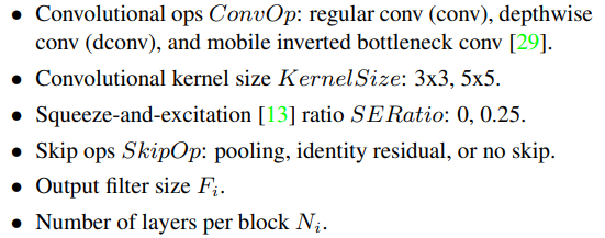 위 사진은 MNAS에서 사용하는 연산 및 파라미터의 종류를 보여주고 있습니다.