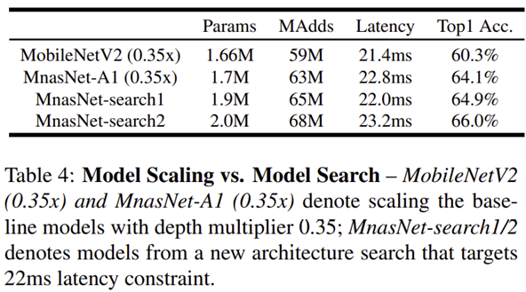 - 결과적으로 Search를 적용한 모델들 (MNASNet-Search1과 MNASNet-Search2)에서 더 높은 성능을 얻을 수 있다는 것을 보여줍니다.