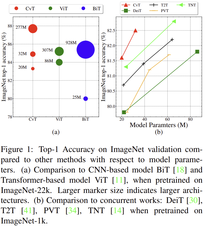 - 그림 1 (a)는 ViT, BiT 그리고 본 논문에서 제안하는 CvT 사이의 비교를 수행하고 있습니다. BiT에 비해 파라미터는 훨씬 적지만 성능은 훨씬 높네요. 그림 1 (b)에서는 주로 Transformer 기반 모델들과 비교하고 있습니다. 다른 Transformer 모델들과도 비교했을 때 속도와 성능을 모두 압도하고 있습니다.