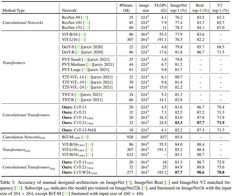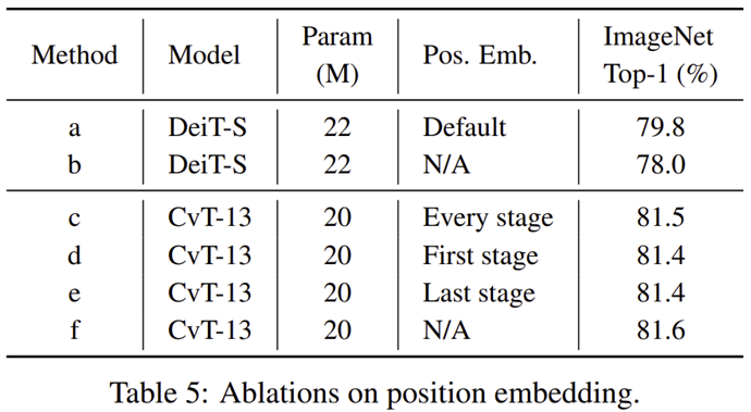 - 이러한 실험 결과는 CvT에 내장된 convolution 연산이 positional embedding을 대신한다고 결론 지을 수 있습니다.