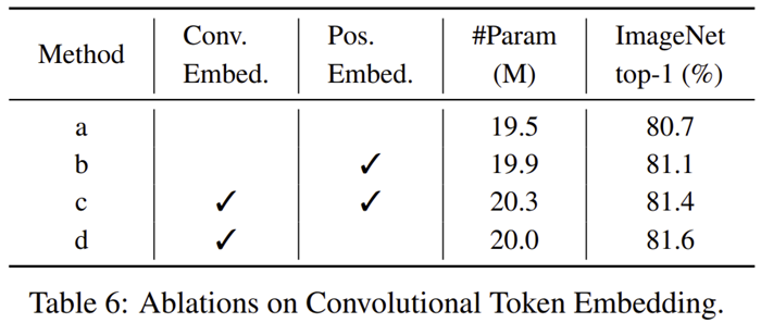 - 표 6은 Convolutional Token Embedding에 대한 실험 결과입니다. 여기서도 마찬가지로 positional embedding 유무에 대한 실험과 함께 Convolutional Token Embedding vs patchify에 대한 실험을 수행합니다.