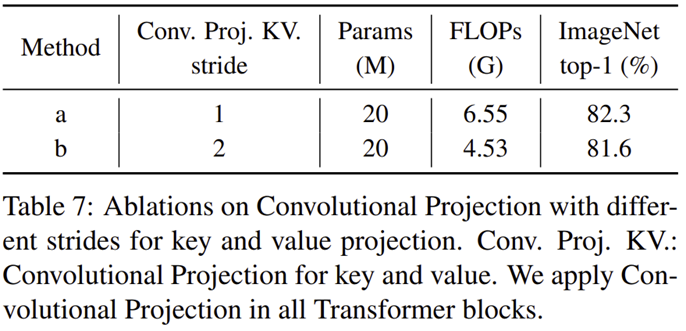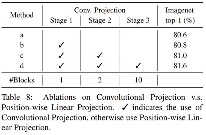 - Convolutional Projection을 점점 많은 stage에 추가할 수록 성능이 점점 증가하는 것을 볼 수 있죠.