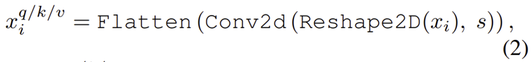 사실 연산하는 과정도 굉장히 단순합니다. 기본적으로 입력되는 $x_{i}$는 현재 1D로 flatten된 patch 형태이기 때문에 이를 2D로 바꾸는 Reshape2D를 먼저 거칩니다. 그래야 2D Convolution을 적용할 수 있겠죠. 다음으로 Depth-wise Convolution + Batch Normalization + Point-wise Convolution으로 구성된 Conv2d를 적용합니다. 여기서 $s$는 Depth-wise Convolution에서 사용하는 커널의 크기를 의미합니다. 그 다음 Flatten을 거치면서 최종적으로 $Q, K, V$를 얻을 수 있습니다. 이는 이후 Multi-Head Self-Attention을 통과하여 흔히 저희가 알고 있는 Self-Attention을 수행하게 됩니다.
