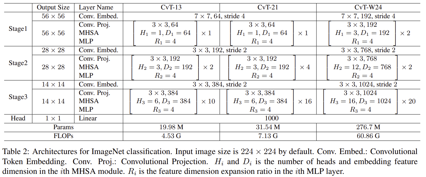 본 모델도 다른 Transformer 모델과 마찬가지로 파라미터의 개수에 따른 모델을 여러 제시합니다. 모델의 규모는 주로 각 stage의 블록 개수와 hidden feature의 개수에 따라 결정됩니다. 주의하셔야할 점은 기존 Transformer 모델과는 다르게 3개의 Stage로 구성되어 있다는 점 입니다. 그리고 $X$를 CvT 내에 존재하는 Transformer 블록의 개수라고 할 때 CvT-$X$라고 적을 수 있습니다. 즉, CvT-13와 CvT-21은 각각 13개, 21개의 Transformer 블록을 가지는 모델입니다.