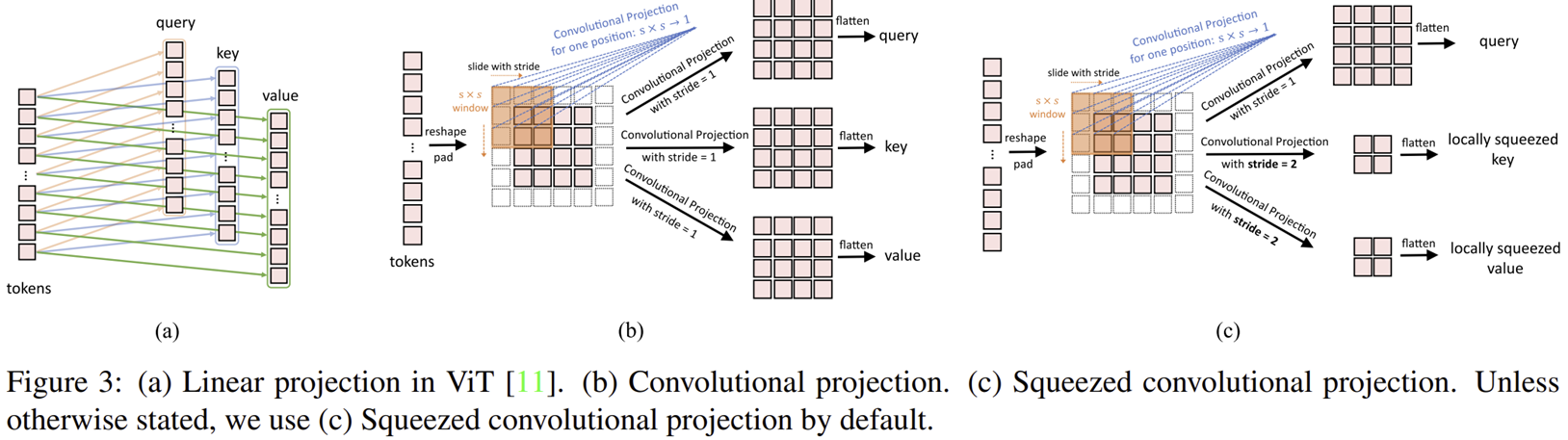 그림 3은 개인적으로 CvT의 제일 핵심이라고 생각하는 부분 중에 하나 입니다. 최근 등장하는 다양한 Transformer 기반 모델들 모두 Depth-wise Separable Convolution을 사용하는 데 본 논문은 그 이유를 뒷받침해주기 때문이죠. 이 구조를 통해 CvT는 CNN이 가지고 있던 local spatial context를 Transformer에 부여하고 $K$와 $V$의 sub-sampling을 통한 효율성도 함께 챙길 수 있게 됩니다.