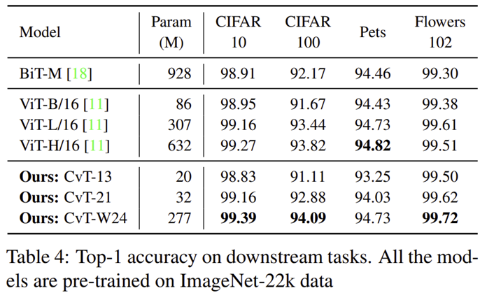 - 표 4는 CvT의 다른 데이터셋으로의 Transferability를 측정하고 있습니다. 각 모델들은 모두 ImageNet-22K에 사전학습하고 각 데이터셋 (CIFAR10, CIFAR100, Pets, Flowers102)에 fine-tune을 진행하였습니다.