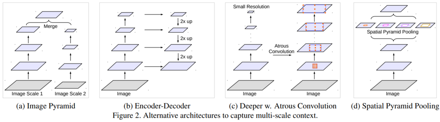 그림 2는 Multi-Scale 정보를 추출할 수 있는 4가지 방식에 대해서 설명하고 있습니다. (a)는 input level에서 서로 다른 크기의 영상을 입력하여 하나로 합칩니다. 영상 내 특징 추출의 유명한 알고리즘 중 하나인 SIFT에서도 이러한 방식을 사용합니다. (b)는 UNet 기반 심층 신경망 구조에서 자주 활용되는 encoder-decoder 구조입니다. (c)와 (d)는 DeepLabV1과 DeepLabV2에서도 이용되었던 Atrous Convolution을 사용하는 것을 볼 수 있습니다. 다만, (c)는 cascade 방식으로 단계적으로 atrous convolution의 dilation을 점차 늘리는 방식입니다. 반면에 (d)는 parallel 방식으로 가장 깊은 단계에서 서로 다른 크기의 dilation을 가지는 atrous convolution을 적용한 뒤 하나로 합치는 방식입니다. atrous convolution에 대한 자세한 내용은 지난 포스팅을 참고해주시면 감사하겠습니다.