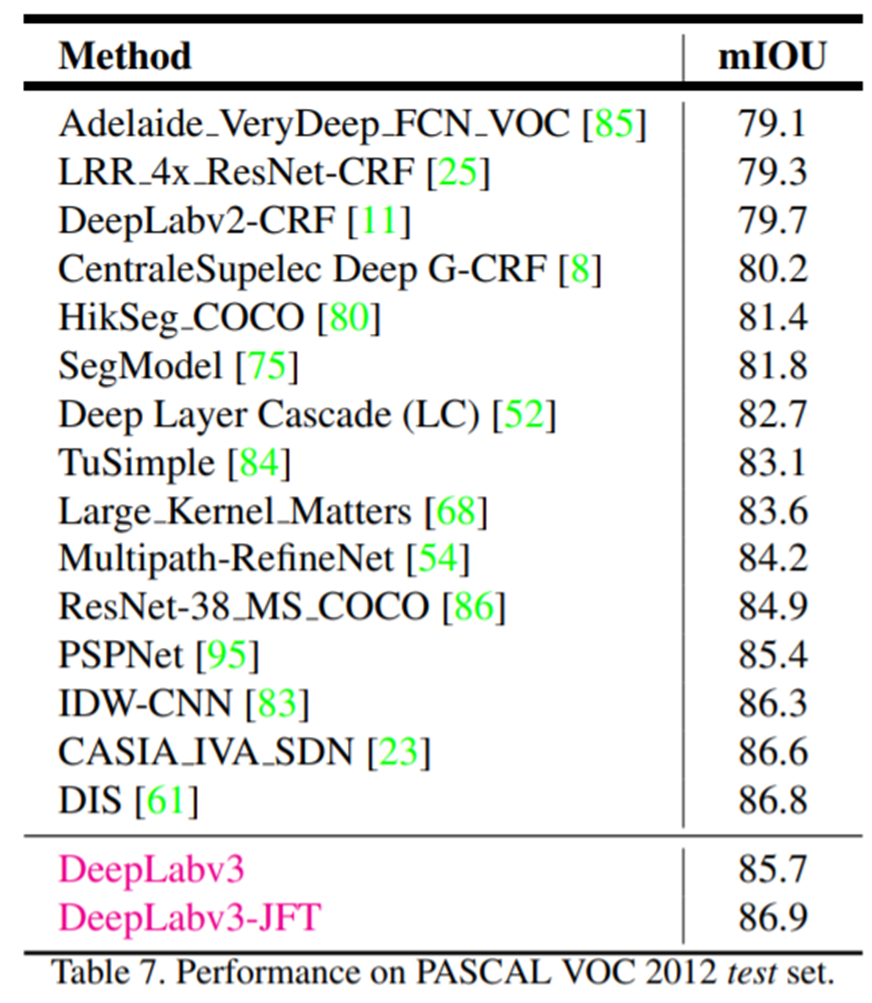 표 7은 state-of-the-art 방식들과 DeepLabV3 사이의 성능 비교를 보여주고 있습니다. 여기서 JFT라고 붙은 거는 JFT로 pre-trained된 backbone 모델을 사용했다는 것을 의미합니다. 참고로 해당 논문 역시 구글에서 냈기 때문에 저희는 JFT를 사용할 수 없습니다.