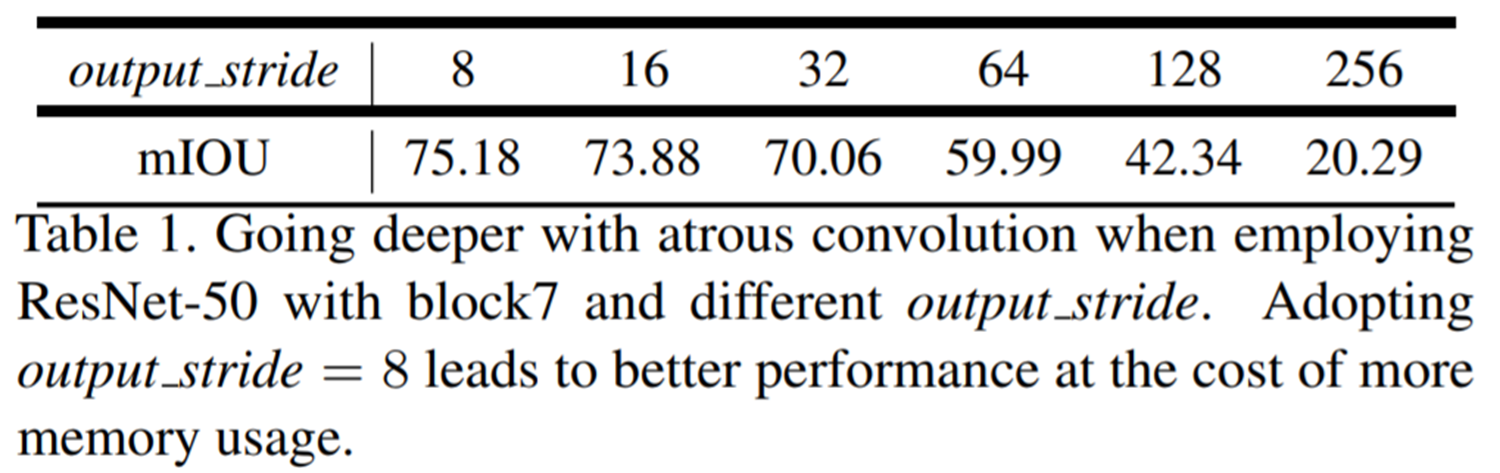 본 논문에서는 표 1과 같이 실험적으로 segmentation에서는 output stride가 8인 경우와 16인 경우가 가장 적절했음을 밝혀내게 됩니다.