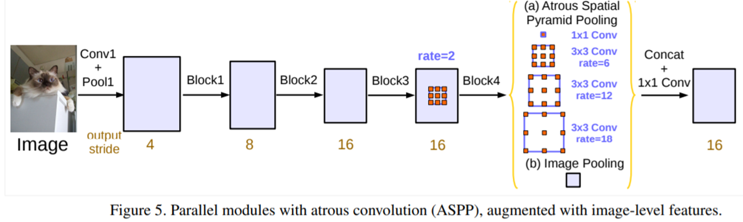 따라서, 저자들은 그림 3과 같이 cascade한 방식과 그림 5와 같이 parallel한 방식을 각각 고려해줍니다. 이때, DeepLabV3에서는 앞으로 대부분의 segmentation 논문에서 사용되는 용어인 output stride라는 개념에 대해서 언급합니다. 이는 현재 특징맵이 입력 영상에 비해 몇 배나 작은지를 의미합니다. 예를 들어, 입력 영상의 가로세로 길이가 256이고 첫번째 단계에서 특징맵의 크기가 64로 줄어들었으면 $\frac{256}{64} = 4$이므로 output stride는 4가 됩니다.