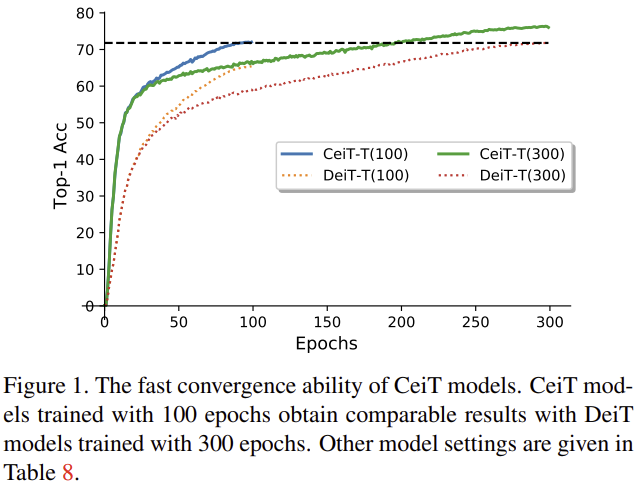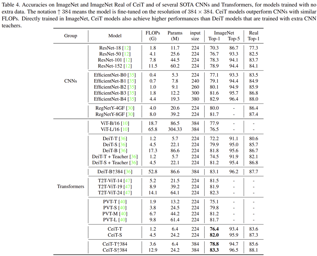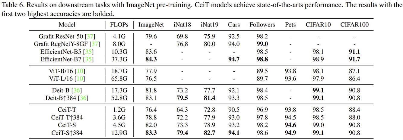 - ImageNet-1K에서 학습된 CeiT는 lightweight하고 efficient한 모델일 뿐만 아니라 state-of-the-art 성능을 달성
