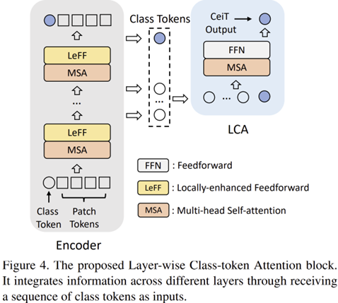하지만 여기서 중요한 것은 LCA에서는 패치 토큰을 사용하지 않고 각 계층의 클래스 토큰을 사용한다는 점입니다. 이는 기본적으로 클래스 토큰에서는 Transformer의 represention correlation이 집약되어 있다고 가정하기 때문에 가능하죠.