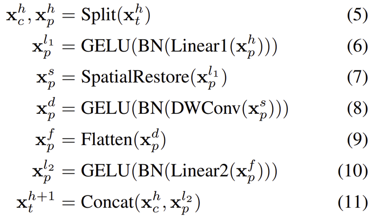 다음으로 원래 크기의 채널 개수로 변환해주기 위해 다시한번 더 linear projection을 적용하여 $\mathbf{x}_{p}^{l_{2}} \in \mathbb{R}^{N \times C}$로 줄여줍니다. 그리고 분리되어 있던 class token $\mathbf{x}_{c}^{h}$와 결합하여 출력 토큰 $\mathbf{x}_{t}^{h + 1} \in \mathbb{R}^{(N + 1) \times C}$을 얻게 됩니다.