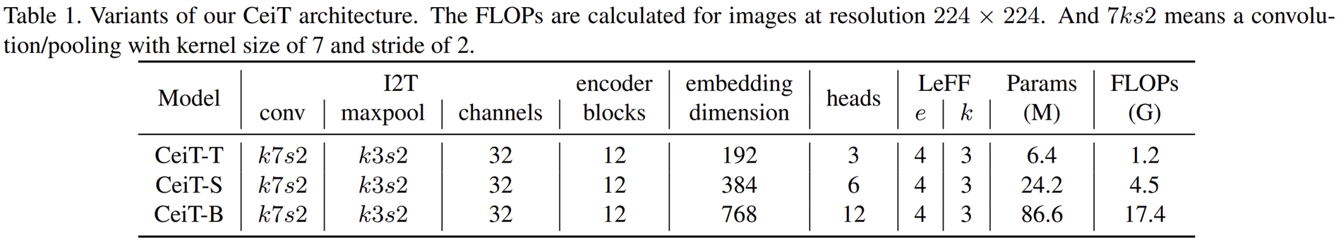 CeiT 역시 기존 Transformer 모델들과 마찬가지로 규모에 따라 변형 구조를 만들어 각각 CeiT-T, CeiT-S, CeiT-B를 만들어제시합니다.