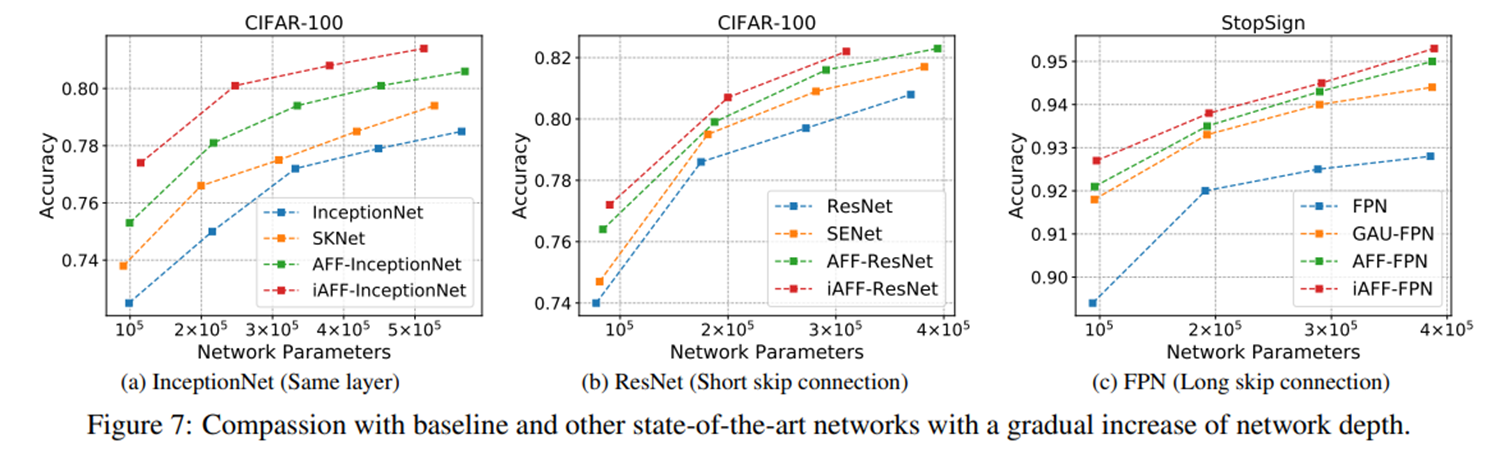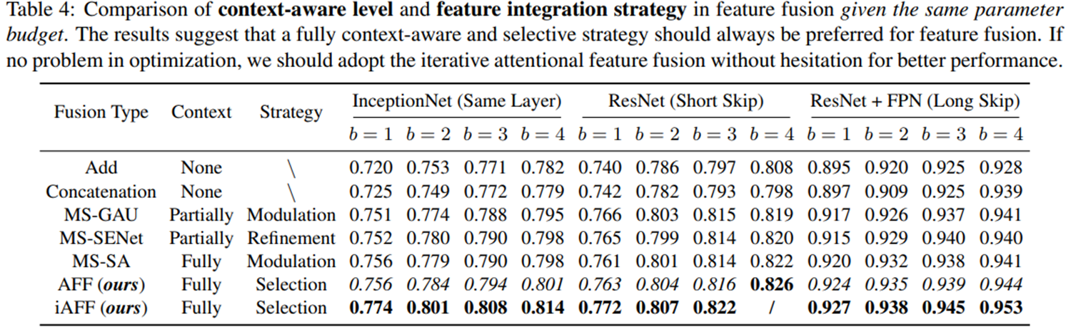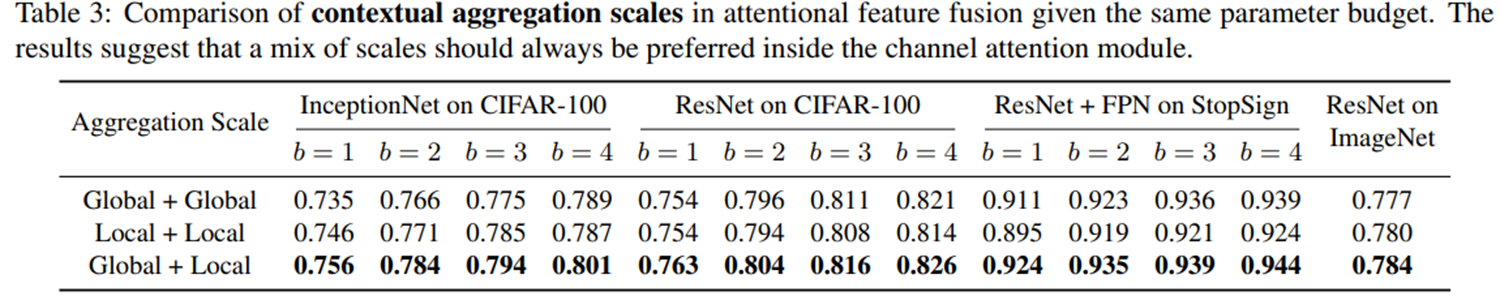 먼저 본 논문에서는 그림 4와 같이 Global + Global 그리고 Local + Local Feature Aggregation 변형 모델을 구현한 뒤 Global + Local Feature Aggregation의 효과에 대해서 보여주고 있습니다. 이는 AFF 모듈을 InceptionNet, ResNet, FPN에 적용한 결과를 표 3에서 볼 수 있습니다. 결과적으로 Global + Local Feature를 사용하는 것이 전체적으로 성능이 좋은 것을 볼 수 있습니다.