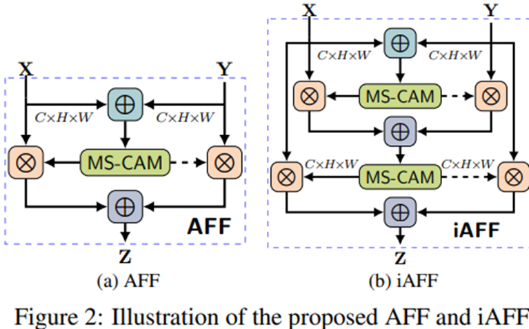 그림 2에서는 AFF와 iAFF를 보여주고 있습니다. 일단, AFF부터 보도록 하죠. 여기서 $\oplus$는 원소별 덧셈을 의미합니다. 즉, 처음에 두 개의 feature map $\mathbf{X}$와 $\mathbf{Y}$를 입력받으면 두 feature map을 더한 뒤 MS-CAM을 적용하는 것을 볼 수 있죠. 아주 간단합니다! 이를 수식으로 정리하면 다음과 같이 쓸 수 있습니다.