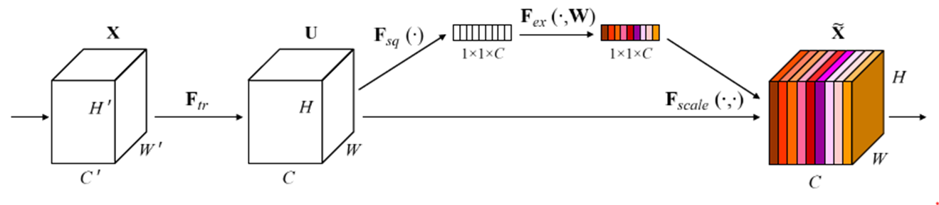 채널 어텐션에 있어 가장 기본이 되는 SENet을 다시 한번 분석해보도록 하겠습니다. 입력 feature map $\mathbf{X} \in \mathbb{R}^{C \times H \times W}$가 주어졌을 때 채널 어텐션 맵 $\mathbf{w} \in \mathbb{R}^{C}$는 다음과 같이 얻을 수 있습니다.