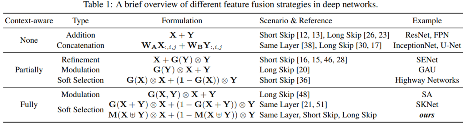 표 1은 지금까지 제안된 다양한 채널 어텐션 모듈들과 본 논문에서 제안된 AFF의 수식적인 차이를 보여주고 있습니다.
