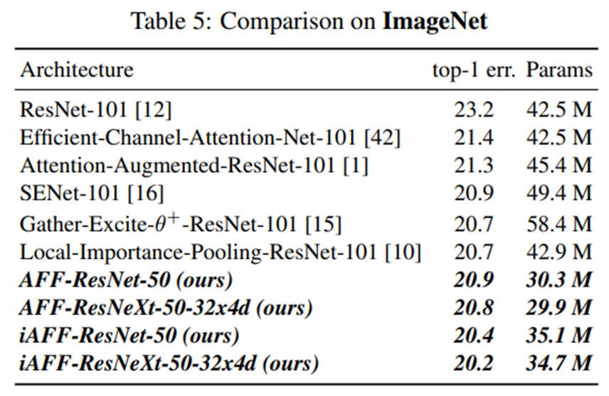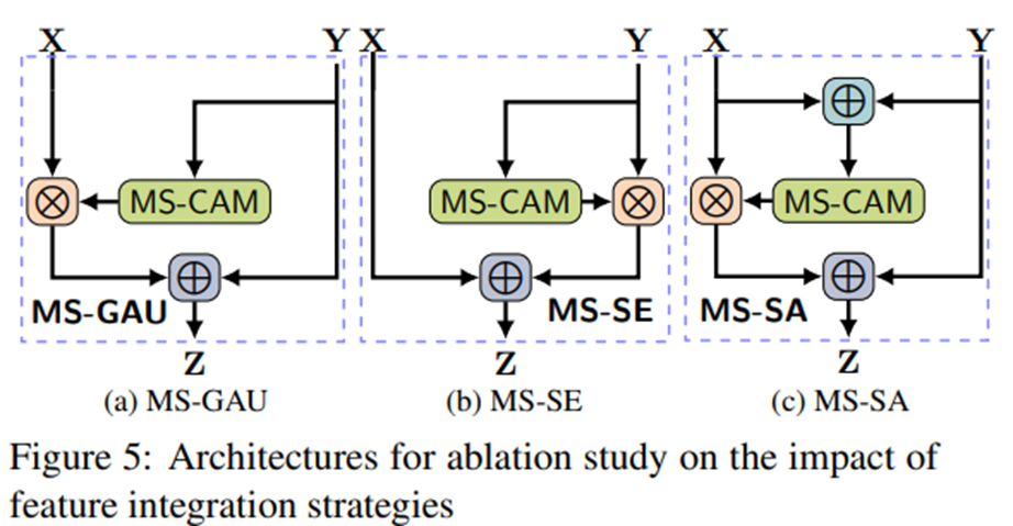 다음으로 그림 5와 같이 표 1에서 보았던 기존 채널 어텐션 모델들인 GAU와 SE Block, SA Block 등의 형태로 실험을 진행하였습니다. 결과적으로 AFF와 iAFF의 형태로 했을 때 가장 좋은 성능을 보이네요.