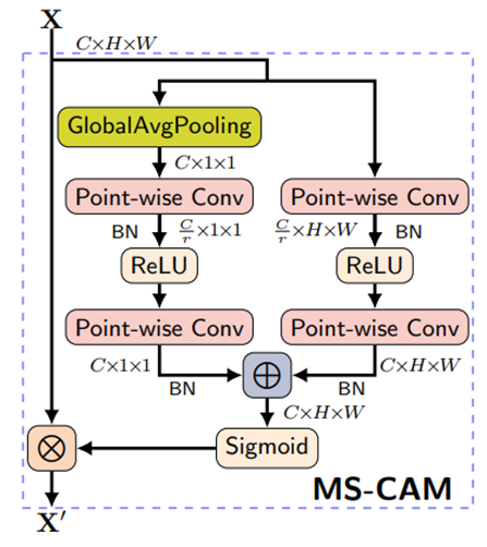 위 그림은 본 논문의 핵심이 되는 MS-CAM의 블록 다이어그램입니다. 이번 절의 제목에서도 볼 수 있다싶이 Local Context와 Global Context를 하나로 합치는 것이 중요한 문제입니다. 이를 위해 본 논문에서는 두 개의 흐름으로 나뉘게 됩니다. 먼저 Local Context를 추출하기 위해 다음과 같이 진행됩니다. 이는 오른쪽 흐름에 해당합니다.