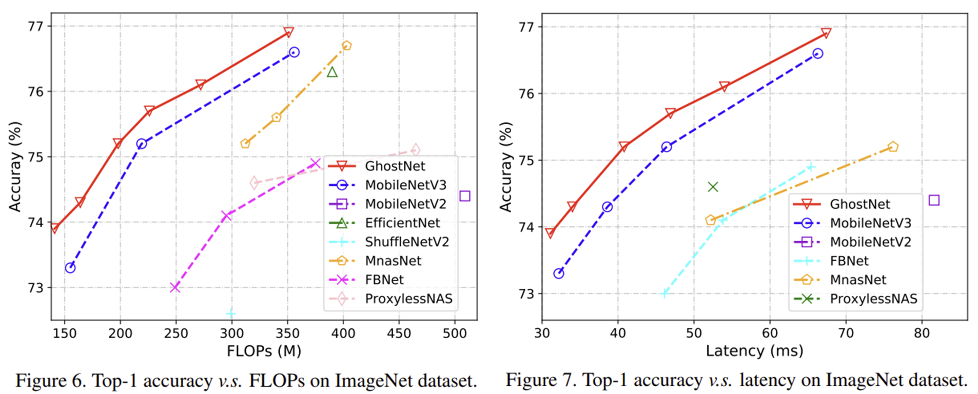 지금까지 제안된 효율성을 강조한 다양한 모델들을 보았습니다. 가장 대표적으로 MobileNet, ShuffleNet, CondenseNet, NASNet 등이 있었죠. 이러한 모델들의 공통점은 모두 성능을 최대한 보존하면서 파라미터 개수나 latency 및 FLOPs를 줄임으로써 스마트폰 또는 자율주행 자동차에 모델을 사용할 수 있게 만드는 것을 목표로 하였습니다. 본 논문에서 제안된 GhostNet 역시 효율성을 강조한 모델입니다. 기존 모델들과는 전혀 다른 방식으로 접근하죠.