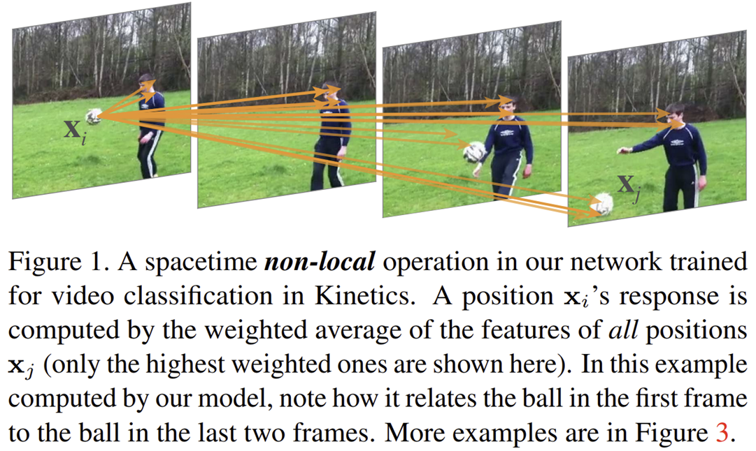 따라서 본 논문에서는 이러한 한계점을 극복하기 위한 non-local operation을 제안합니다. 이는 효율적 (efficient)이며 간단 (simple)하고 일반적 (generic)으로 사용될 수 있는 모듈로써 단 한번의 연산으로 아래 그림과 같이 영상, 비디오, 시퀀스에 관계없이 long-range dependency를 얻을 수 있다는 장정이 있습니다. 이러한 연산으로 기반으로 본 논문에서는 Non-local Neural Network를 제안하였으며 이는 Video Classification, Semantic Segmentation, Keypoint Detection에서 보다 높은 성능을 달성하였습니다.