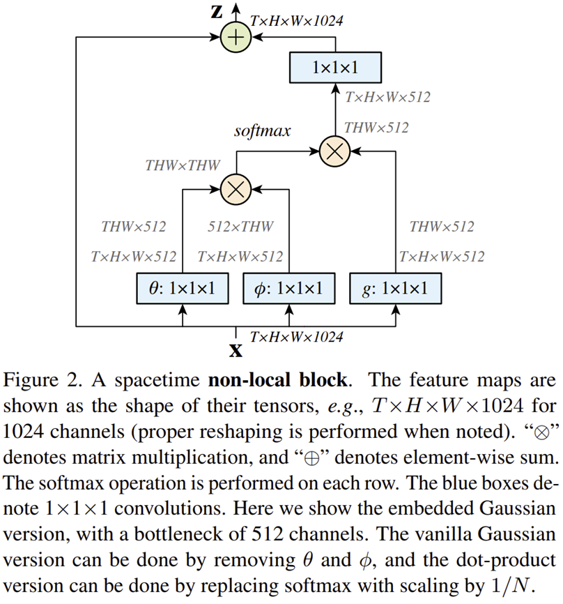 - Embedded Gaussian: $f(\mathbf{x}_{i}, \mathbf{x}_{j}) = e^{\theta (\mathbf{x}_{i})^{T} \phi(\mathbf{x}_{j})}$