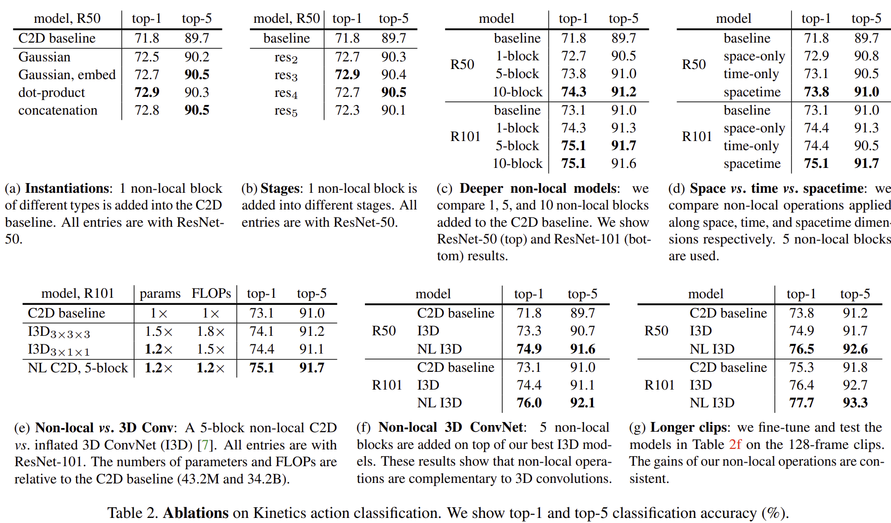 - (f)는 non-local operation을 3D Convolution 모델에 적용했을 때 평가로 이 역시 성능이 크게 증가하는 것을 볼 수 있습니다.