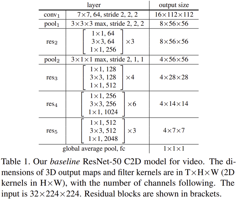 본 논문에서는 Video Classification에서의 성능을 먼저 확인하기 위해 표 1과 같이 단순한 모델을 설계합니다. 해당 모델은 기본적으로 ResNet50을 기반으로 만들었으며 입력 비디오 클립은 32 프레임씩 $224 \times 224$ 크기의 영상이 입력됩니다.