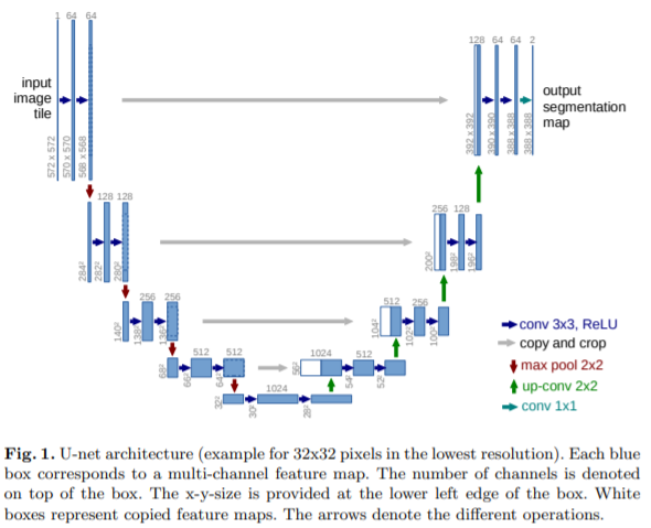 U-net의 네트워크 구조는 위와 같습니다. 실제로 U자형을 그리는 것을 볼 수 있습니다. 구조를 한번 뜯어보겠습니다. 본 논문에서는 크게 2개의 서브 네트워크로 나누어 설명합니다. 각각 contracting path, expansive path라고 합니다. contracting path는 왼쪽의 채널의 개수가 점점 많아지는 네트워크이고 expansive path는 오른쪽의 채널의 개수가 점점 줄어들어 최종적으로는 입력 이미지와의 shape이 동일해지는 네트워크입니다.