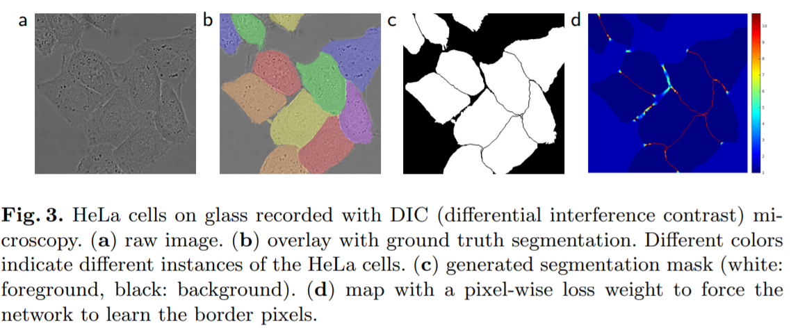 여기서 $w(\mathbf{x})$는 동일한 클래스에 대한 세포의 경계를 분리하기 위한 Weight map loss를 의미합니다.