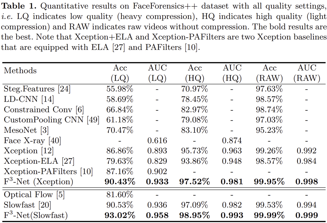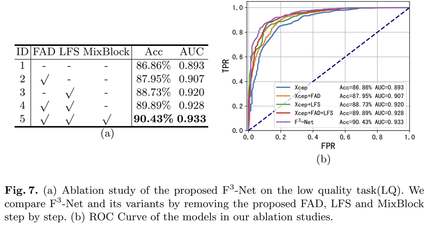 3) 그림 1 (c)에서는 본 논문에서 제안하는 모델인 $F^{3}$-Net을 적용했을 때 XCeption과의 성능 비교를 ROC curve를 이용해서 보여주고 있습니다. 결과적으로 정확도와 AUC가 큰 폭으로 향상된 것을 볼 수 있습니다.